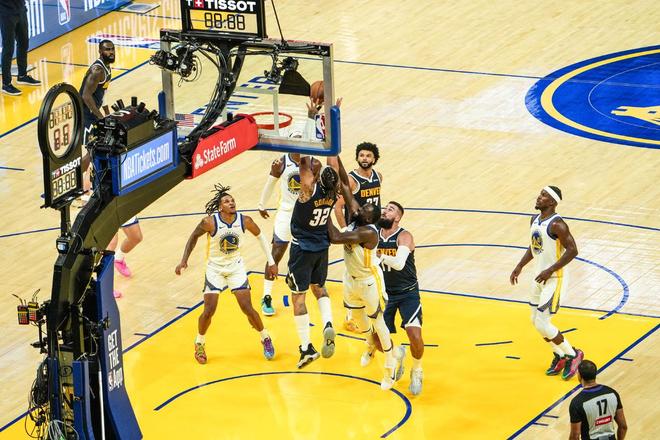 加时赛里,库明加连续冲击篮下未能得分,约翰逊外线不中,库里轰进3分球,戈登打成了2+1还以颜色。库里抛投不中,约基奇篮下得分,霍福德命中三分球。库明加抢断后上篮得分,丹佛请求暂停,穆雷高难度上篮打进。